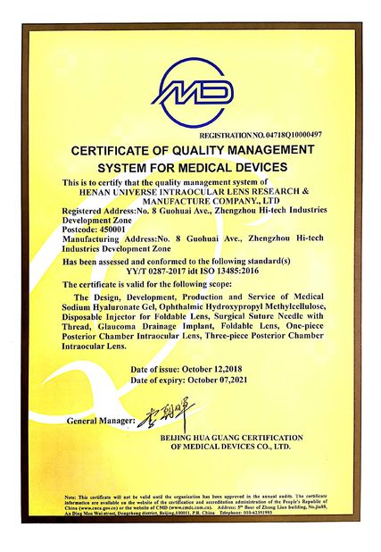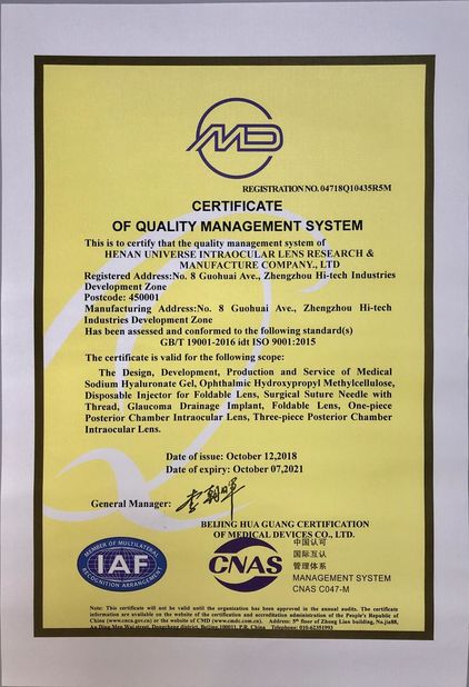 A pesquisa da lente Intraocular do universo de Henan e a fabricação Co., Ltd foram fundadas em 1991, são uma das primeiras empresas em China para produzir lentes intraocular e produtos relacionados. A empresa insistiu em tomar a estrada que a importação da tecnologia combina com o desenvolvimento independente por muitos anos e esteve concedida pelas administrações nacionais realted para seus produtos e realizações da pesquisa científica. A empresa obteve o ISO9001, certificados do sistema de controlo da qualidade ISO13485, que tem o bulit um alicerce sólido para nosso controle da qualidade.